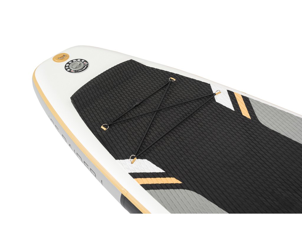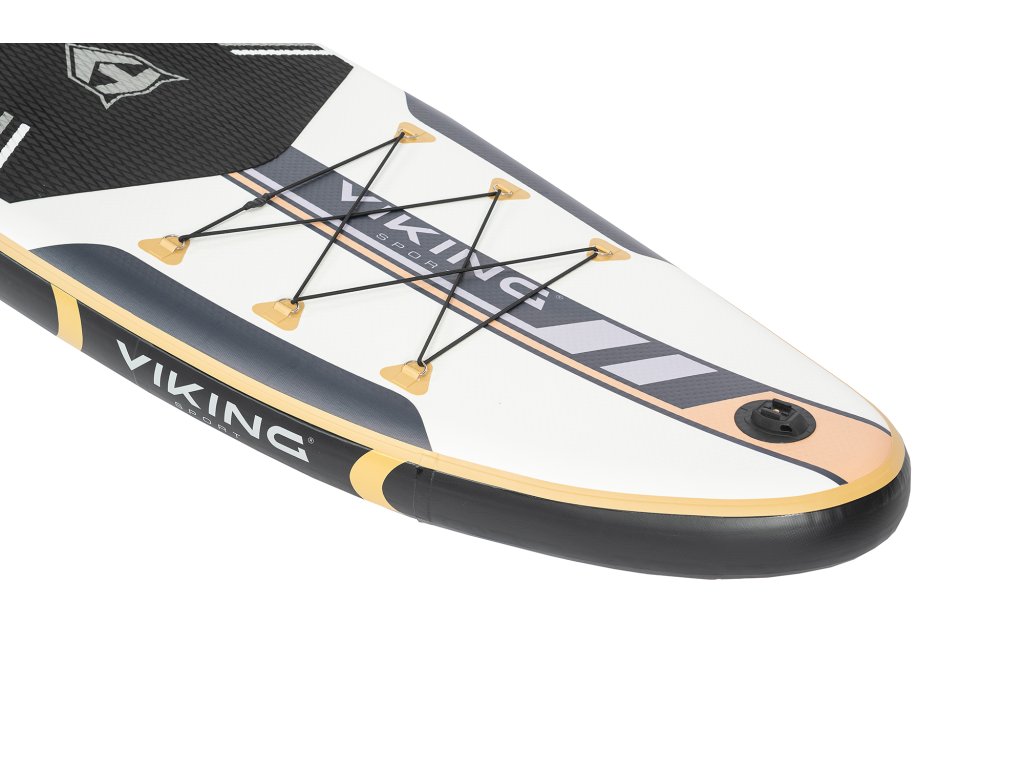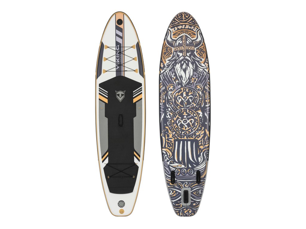 Paddleboard spája moderný dizajn s výraznou vikingskou symbolikou v elegantnej kombinácii bielej, čiernej a zlatej. Protišmyková podložka EVA poskytuje pohodlie aj stabilitu pri jazde. Spodná strana zaujme motívom vikingského bojovníka a lode, ktoré podčiarkujú silu a dobrodružný charakter paddleboardu. Tri plutvy potom zaisťujú lepšiu stabilitu a ľahšie ovládanie na vode.
