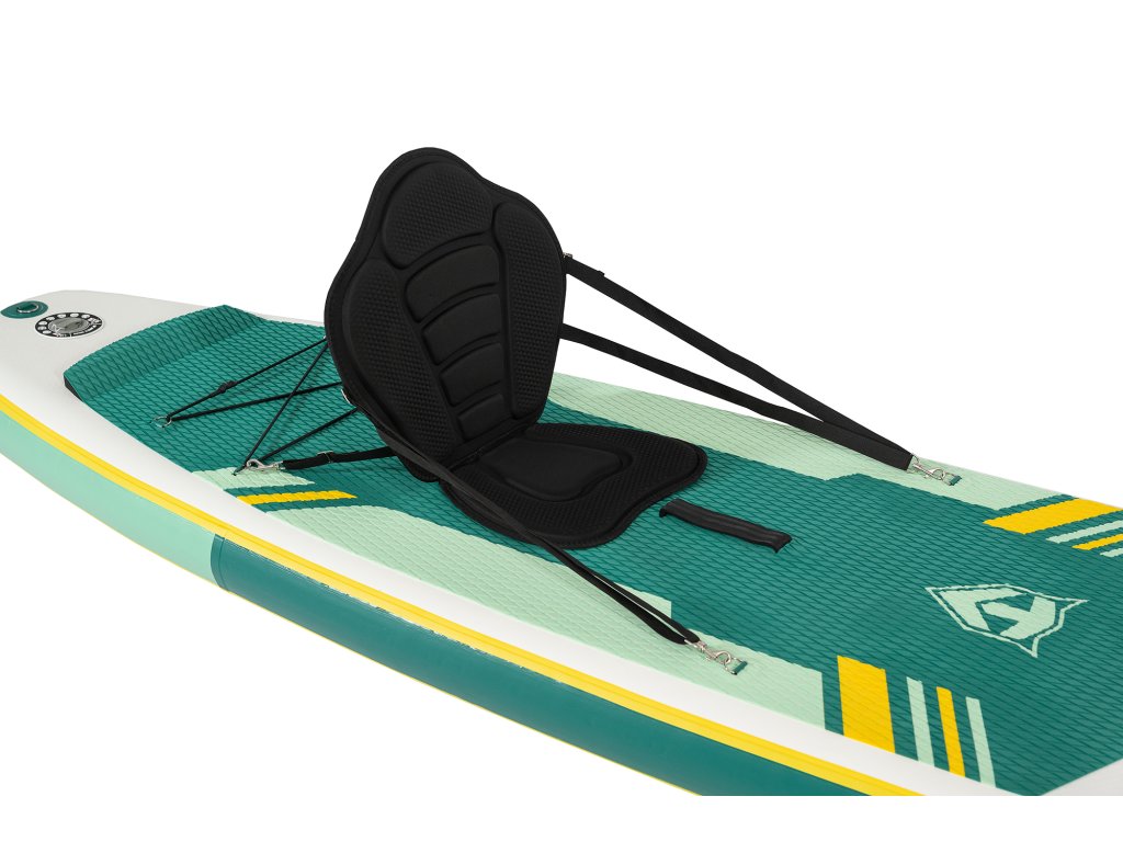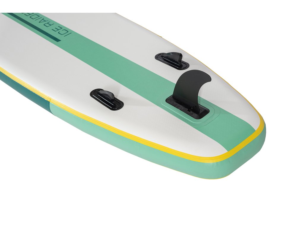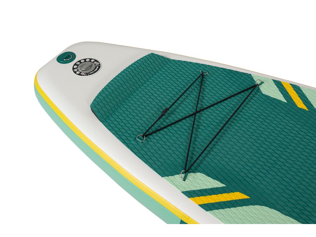 Paddleboard zaujme sviežim dizajnom v kombinácii bielej, zelenej a žltej, ktorý pôsobí moderne a čisto. Protišmyková podložka EVA zaisťuje pohodlný a stabilný postoj počas jazdy. Spodná strana je elegantne jednoduchá a doplnená tromi plutvami, ktoré zvyšujú stabilitu a uľahčujú ovládanie na vode.