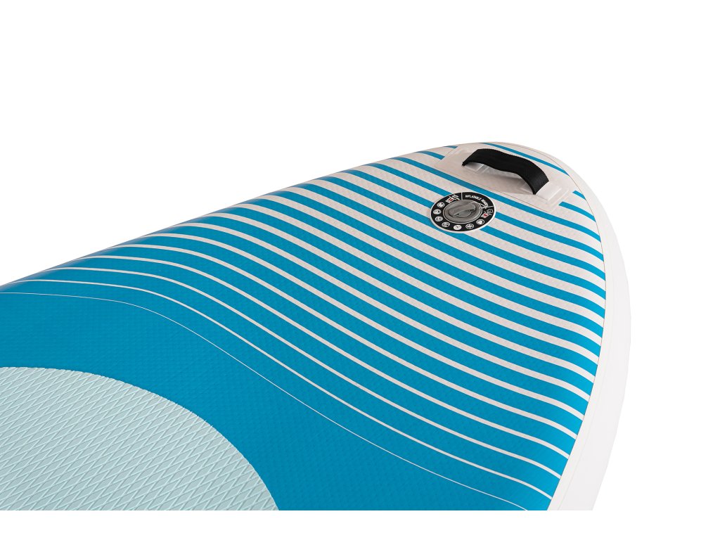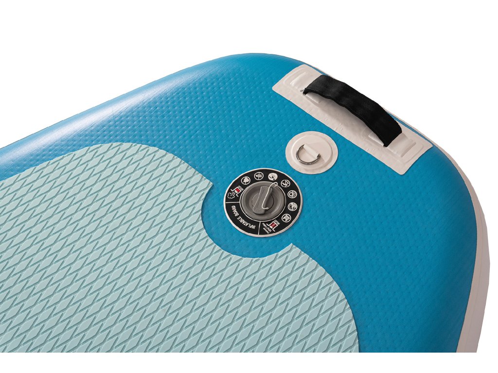 Tento veľký paddleboard zaujme moderným a hravým dizajnom v modrej, bielej a červenej. Protišmyková podložka EVA zaisťuje pohodlný a stabilný postoj počas jazdy. Spodná strana je elegantne jednoduchá a doplnená tromi plutvami, ktoré zvyšujú stabilitu a uľahčujú ovládanie na vode.