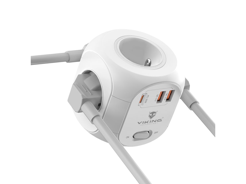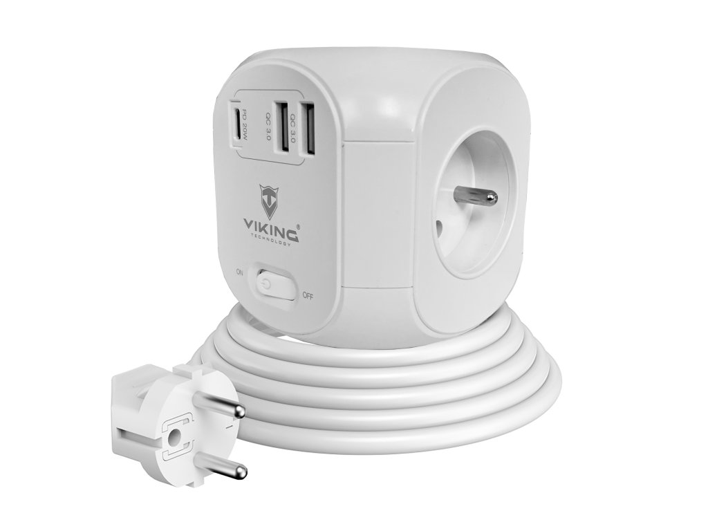Sieťový adaptér Viking AC Cube PD je praktickou kombináciou štyroch zásuviek, troch USB portov a 1,8 m predlžovacieho kábla v jednom, ktorý šetrí miesto a umožňuje napájanie až 7 zariadení súčasne.
