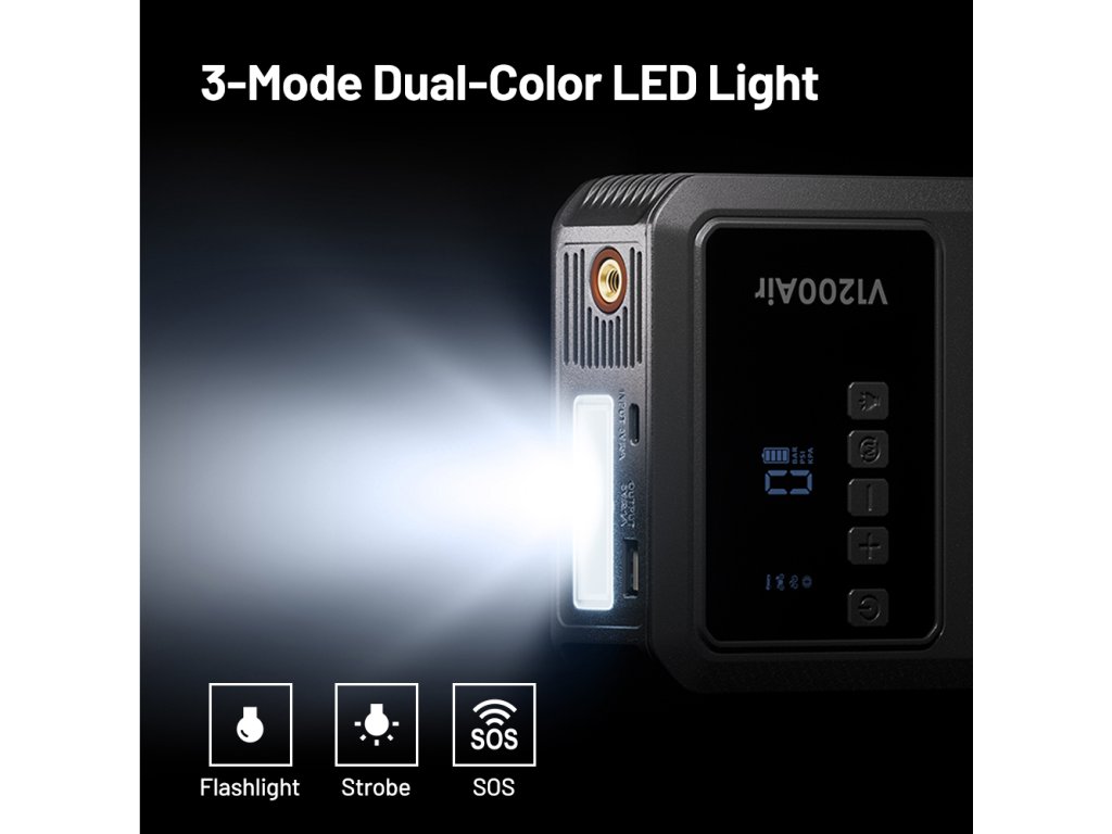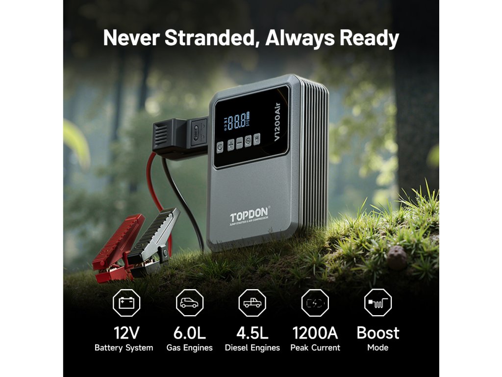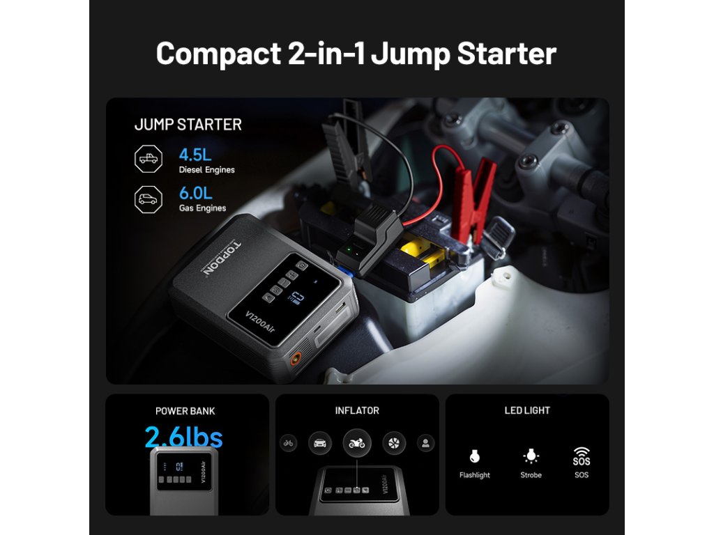 TOPDON V1200 Air je multifunkčné zariadenia, ktoré vám ušetria miesto v kufri aj starosti na cestách. Vďaka štartovaciemu prúdu 1200 A spoľahlivo naštartuje 12V vozidla - osobné autá, motorky, SUV aj menšie dodávky. Už sa nemusíte obávať vybitých batérií, pretože pomoc je vždy po ruke. S podporou motorov až do 6,0 l benzínu alebo 4,5 l nafty vám V1200Air umožní jednoducho vyraziť v priebehu niekoľkých minút.
