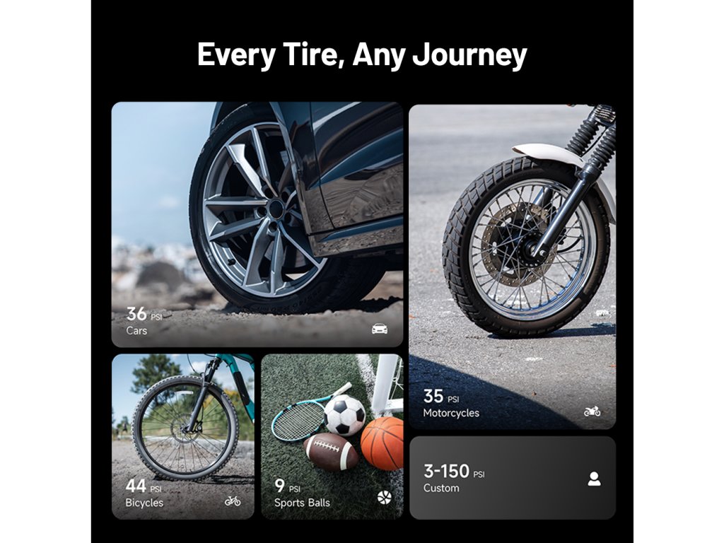 Integrovanýkompresor s maximálnym tlakom 150 PSI nafúkne pneumatiky auta, motorky aj bicykla a nechýbajú ani adaptéry pre športové vybavenie či nafukovacie doplnky. Na prehľadnom LCD displeji ľahko nastavíte požadovaný tlak a kompresor sa sám zastaví po dosiahnutí zadanej hodnoty.